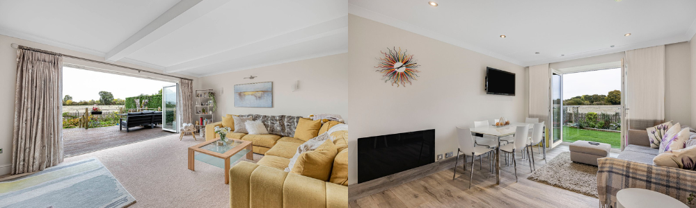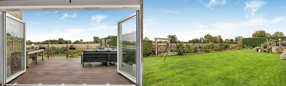 The sitting room is truly something to behold — a stunning picture window frames countryside views to the front, while bi-folding doors at the back spill out onto a decked terrace. Whether it’s winter evenings by the feature open fireplace, or summer gatherings with the doors fully open, this room has year-round magic.
