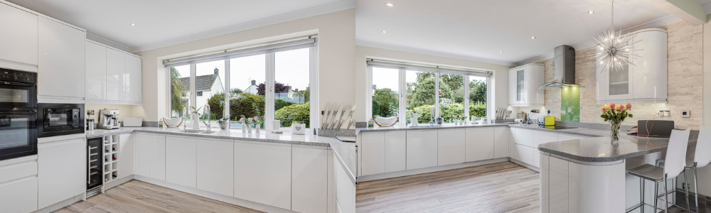 Sleek, contemporary white cabinetry, generous worktops and integrated appliances make this a kitchen you’ll love spending time in. There’s plenty of room for a family dining table and a cosy sofa area overlooking the garden — perfect for lazy mornings with coffee or catching up after school.